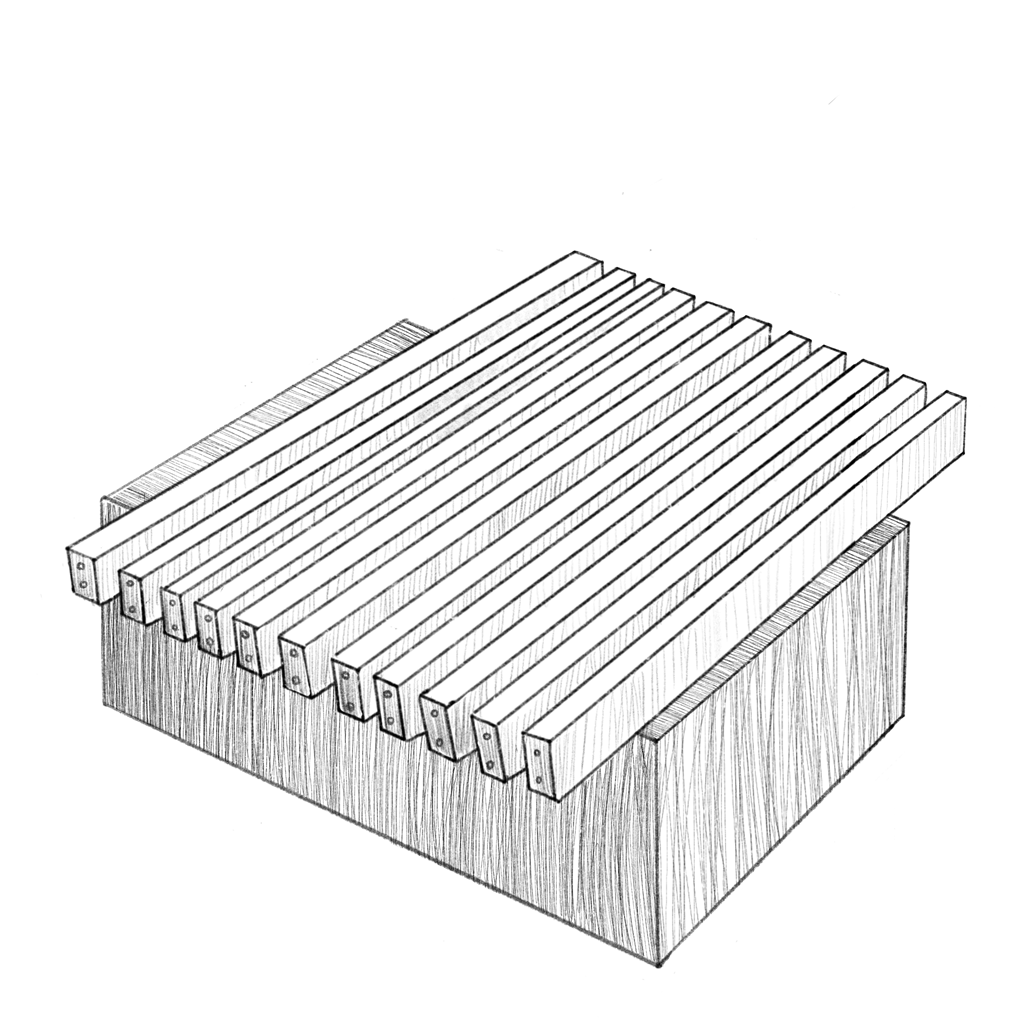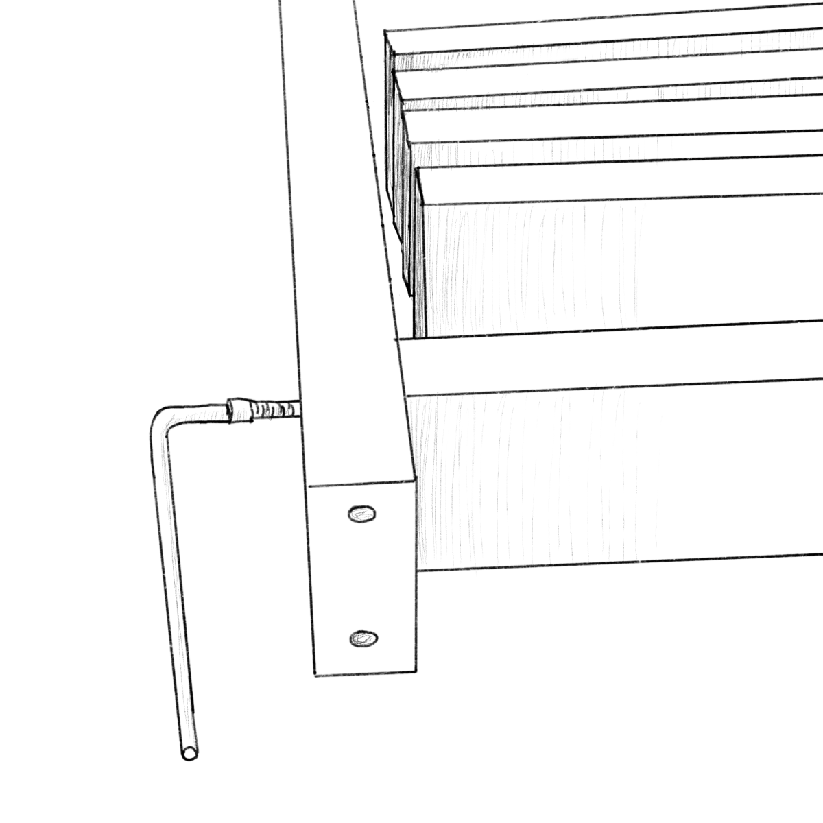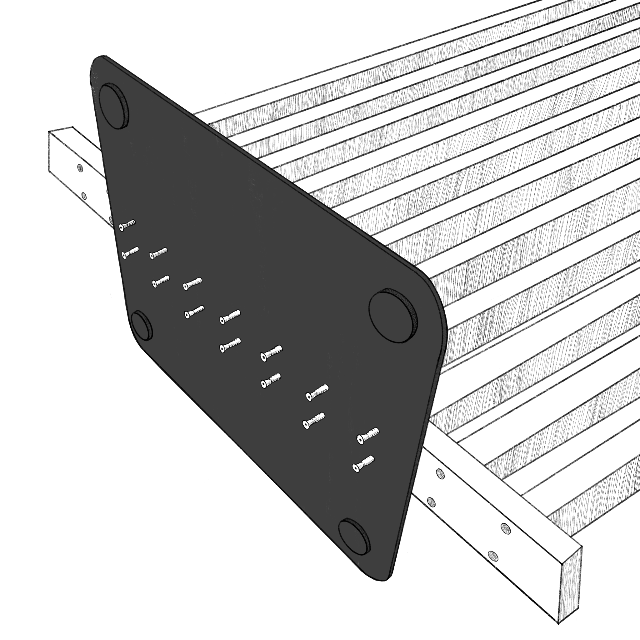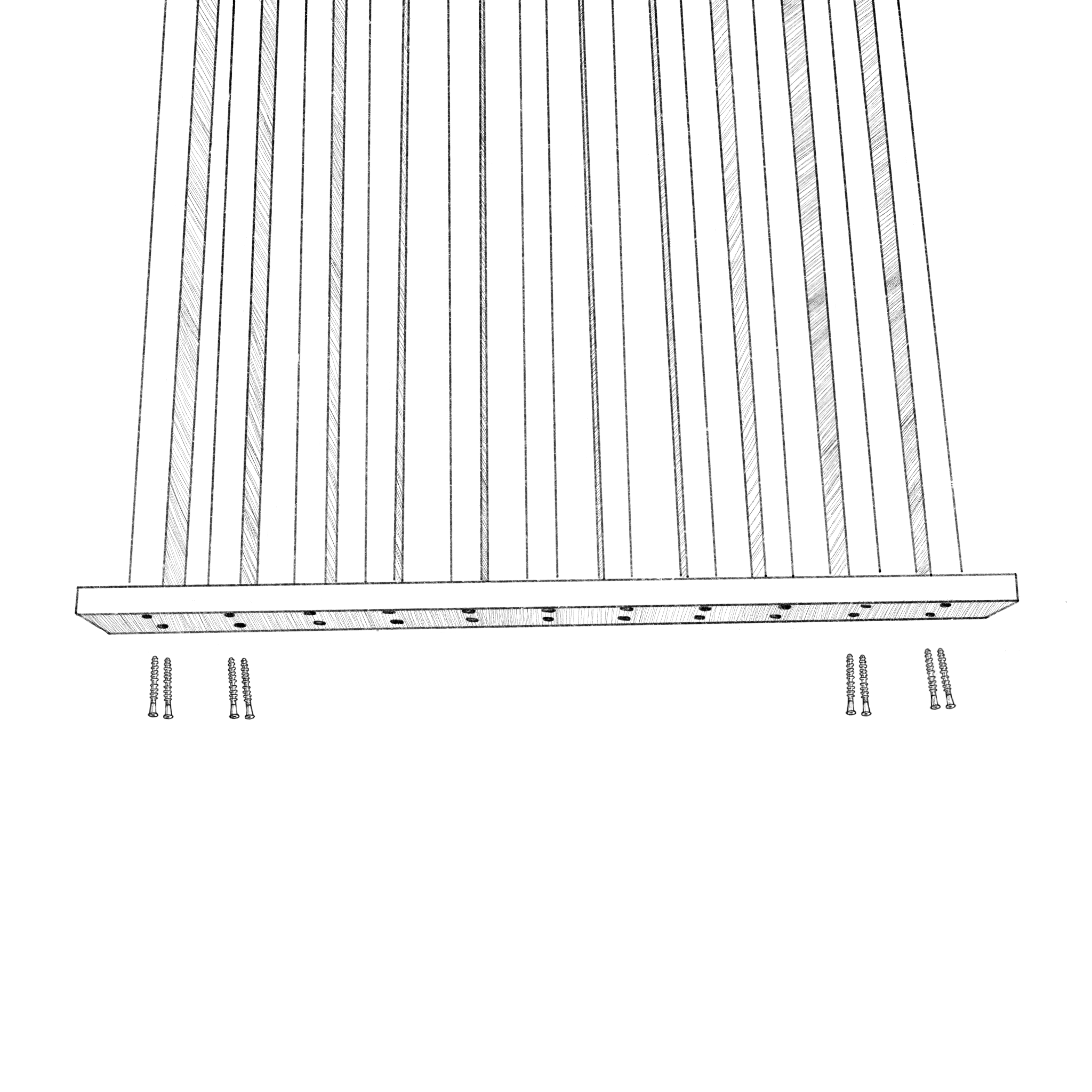 Priečnu lištu priskrutkujte k spodnej časti steny pomocou konfirmátových skrutiek 7x60 iba k prvým a posledným dvom zvislým lamelám na ľavej a pravej strane.
